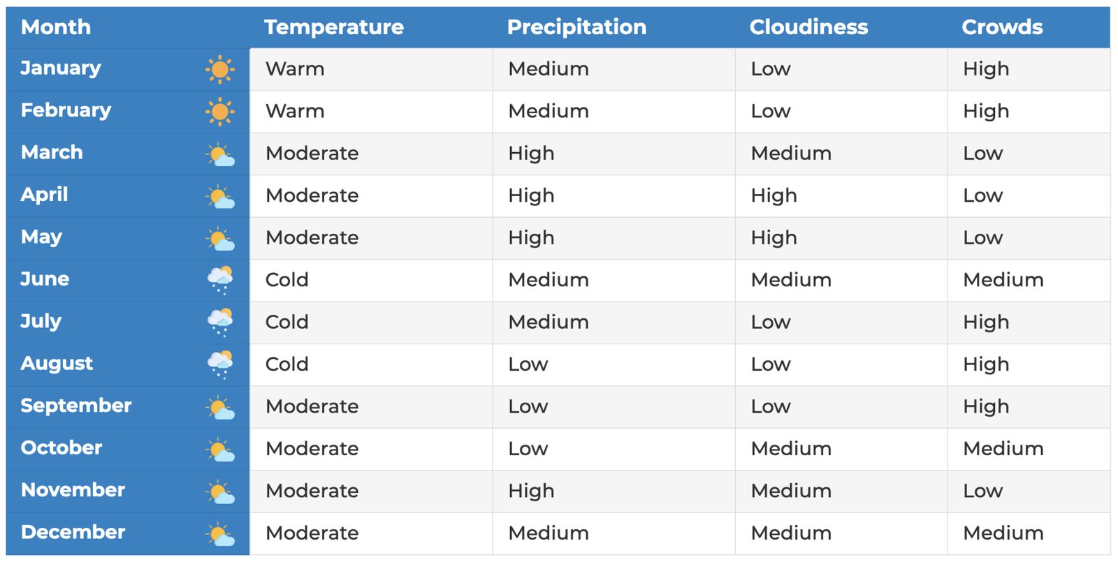 The weather is generally more stable during these periods, with clear skies and moderate temperatures. The wet seasons, from late March to May and from November to December, bring heavy rainfall and the possibility of snow at higher altitudes.
